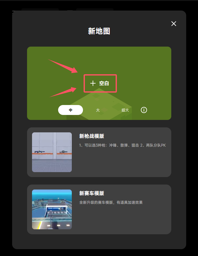 - 空白模板选择:系统提供了中(64×128×64)、大(128×128×128)、超大(256×64×256)三种尺寸的空白模板,以满足不同规模和复杂度的创作需求。请慎重选择,因为一旦确定,地图大小将不可更改。