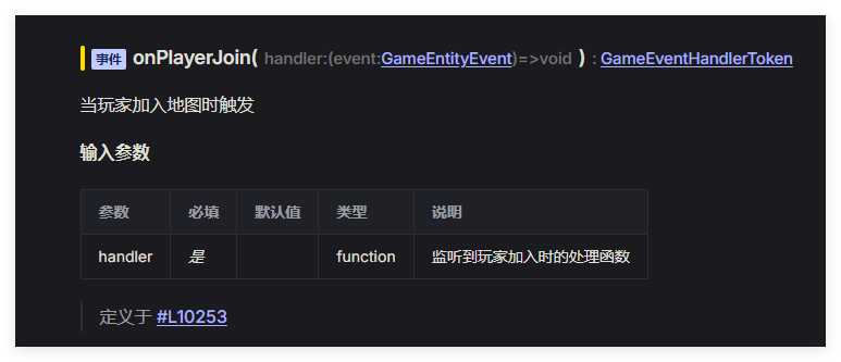 这段代码是一个函数声明的示例,它定义了一个名为onPlayerJoin的函数,该函数接受一个参数,并返回一个GameEventHandlerToken类型的值。下面是对这个声明的详细解释: