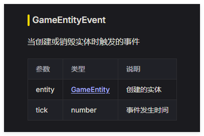 GameEntity):这个属性表示了被创建或销毁的实体。GameEntity是玩家实体本身一个类,它定义了游戏玩家实体的属性和方法。tick(类型: