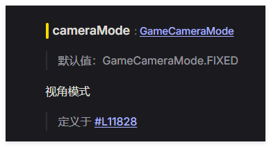cameraMode:这是一个属性名,用于引用或存储与相机模式相关的信息。GameCameraMode:这是一个枚举(Enum),它定义了游戏中相机可以处于的不同模式。