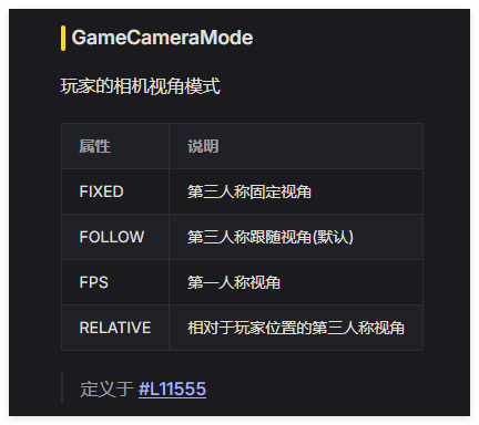 RELATIVE:这个成员表示相对于玩家位置的第三人称视角模式。在这种模式下,相机的位置可能会根据玩家的位置进行某种形式的动态调整。它用于在保持第三人称视角的同时,根据玩家的移动或朝向来调整相机的位置或角度。