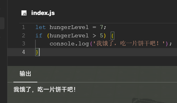 在这个例子中,如果 hungerLevel 大于 5,程序就会输出「我饿了,吃一片饼干吧!」
