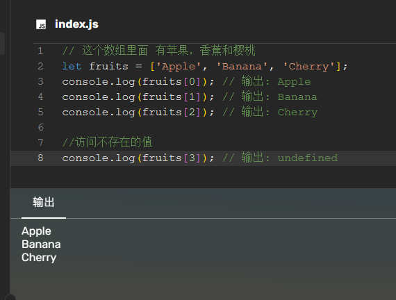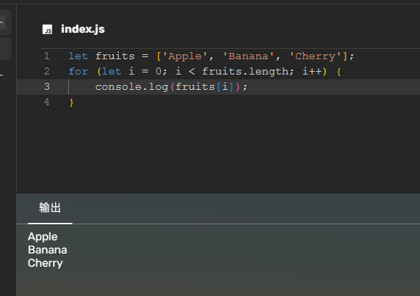 for循环:javascriptlet fruits = ['Apple', 'Banana', 'Cherry']; for (let i = 0; i < fruits.length; i++) { console.log(fruits[i]); }1