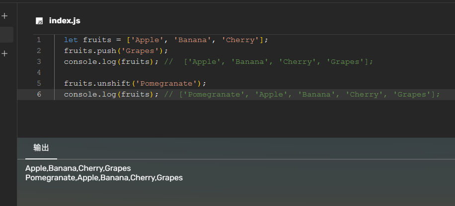 push()方法在数组末尾添加元素,unshift()在数组开头添加。javascriptlet fruits = ['Apple', 'Banana', 'Cherry']; fruits.push('Grapes'); console.log(fruits); // ['Apple', 'Banana', 'Cherry', 'Grapes'] fruits.unshift('Pomegranate'); console.log(fruits); // ['Pomegranate', 'Apple', 'Banana', 'Cherry', 'Grapes']1