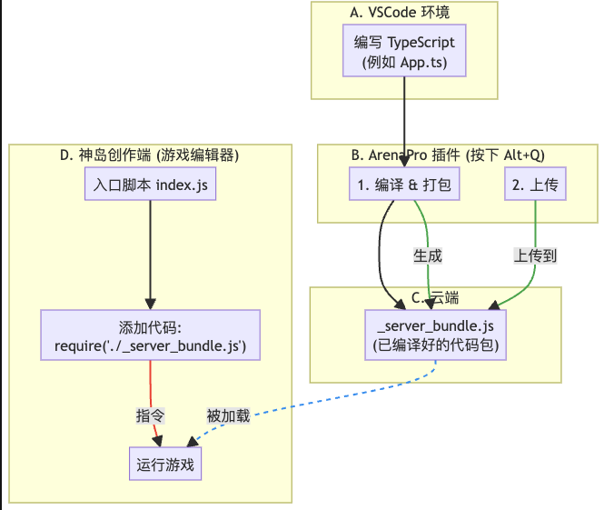 Alt+Q时,ArenaPro 插件会像一个工厂,把我们所有的.ts代码(以及可能的其他模块)编译、打包成一个游戏引擎认识的 JavaScript 文件 (_server_bundle.js)。 - 上传 (ArenaPro): 插件自动将这个打包好的