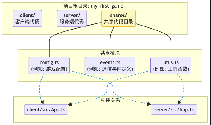 shares/ 文件夹里的代码非常特殊:它既可以被 server/ 目录下的服务端代码引用,也可以被 client/ 目录下的客户端代码引用。