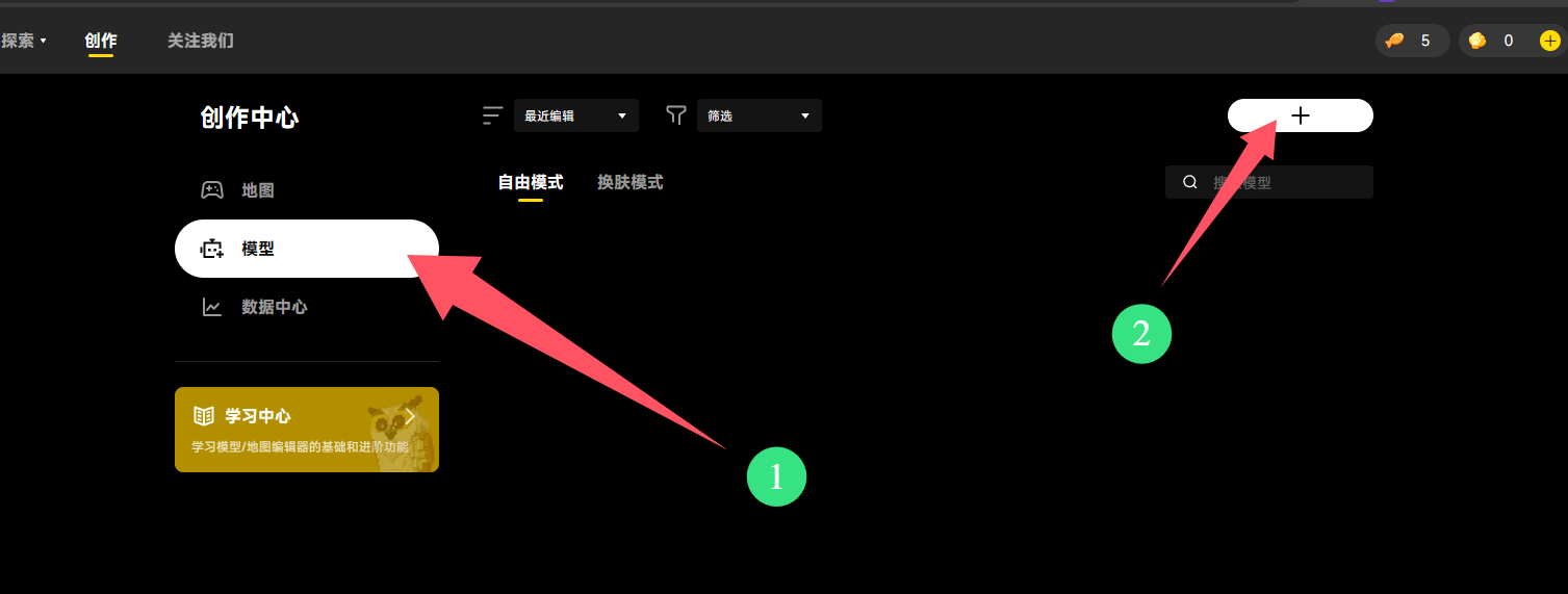 登录后,在界面中寻找模型创作中心,并点击醒目的“+”选项。